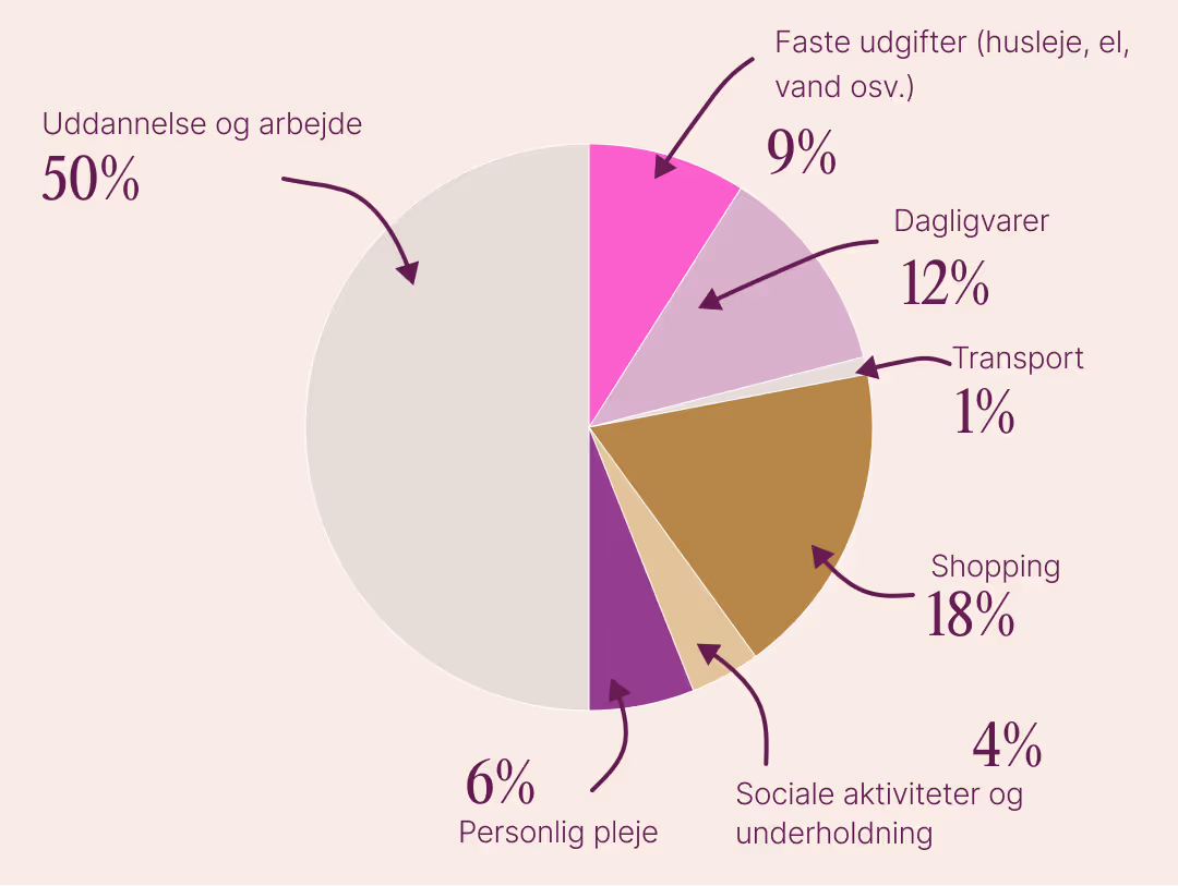 Beløb tilbage efter faste udgifter: ca. 11.250 kr. (1.500 €) – bruges på shopping eller rejser.